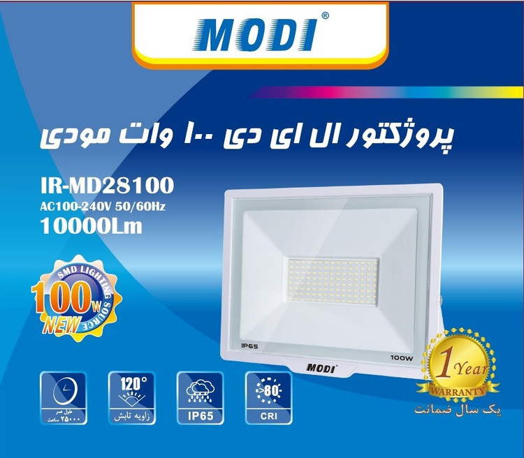پروژکتور ۱۰۰ وات SMD مودی که مشاهده می کنید با مدل IR-MD28100 عرضه می شود که دارای توان مصرفی ۱۰۰ وات است و بسیار کم مصرف محسوب می شود . محصولات مودی بالاترین تنوع را در زمینه لوازم روشنایی ال ای دی در ایران دارد. این پروژکتور دارای قدرت نوردهی بسیار بالا و مصرف فوق العاده کم است. این پروژکتور پس از گذشت زمان و استفاده دچار اُفت نوری نمی شود. پروژکتور ۱۰۰ وات SMD مودی از عمر بسیار طولانی بهره می برد و قابلیت نصب بسیار آسانی دارد . میزان نوردهی این محصول ۱۰۰۰۰ لومن اندازه گیری شده است. می توان پروژکتورهای مودی را جایگزین مناسبی برای لامپ های خیاری و مدادی پرمصرف قدیمی قرار داد.